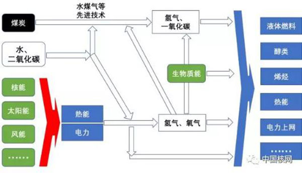 為了讓可再生能源大量發電上網,我們還需要更先進的技術,以核能為基荷的復合能源是目前比較有競爭力的選擇之一。如下圖所示,靈活集成多種能源形式作為輸入,以核能為基荷,并根據所在地區的資源稟賦,一方面可以結合采用一種或多種可再生能源,滿足電力、供熱、海水淡化、制氫等需求,提高新能源利用效率。另一方面,還可以結合化石能源,綜合采用水煤氣、清潔煤等技術,清潔高效的利用煤炭等自然資源,減少碳排放和環境污染,而且除了發電還能生產化工原料,實現能源的梯級利用,能滿足多方面的社會需求。最重要的是,通過管理多種能源引入帶來的動態變化和不確定性,減少對電網的沖擊,實現最大化利用可再生能源。